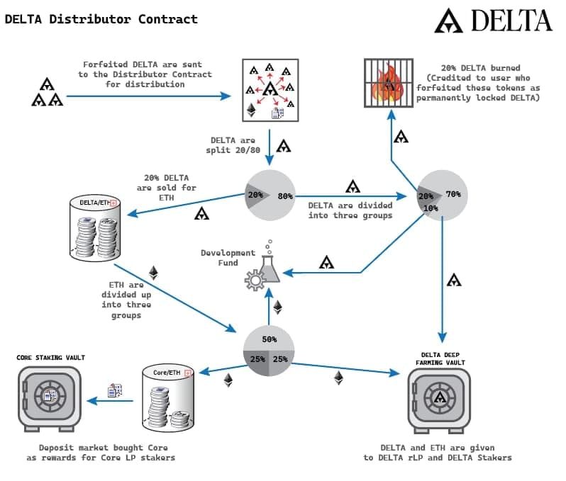 When a user purchases Delta, 10% of the total token balance is sent to the user’s wallet, while the remaining 90% is locked in the Delta Vesting Contract. The locked Delta is unlocked linearly over the next 14 days.